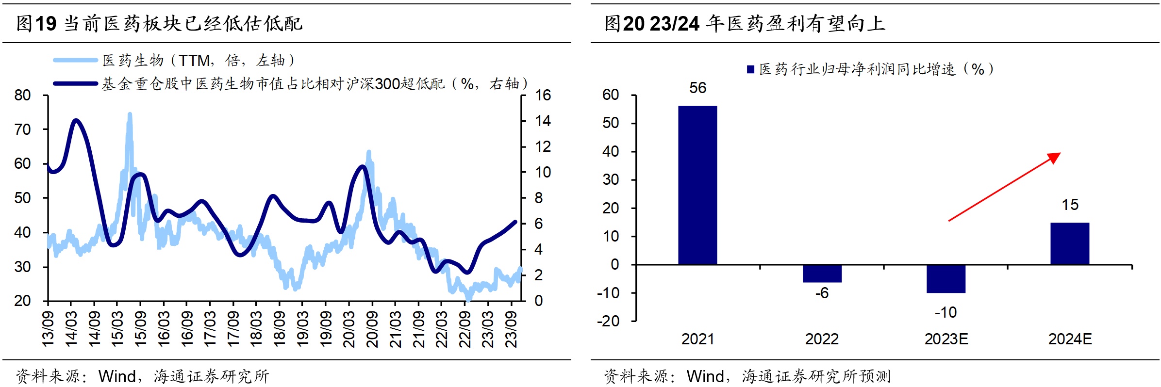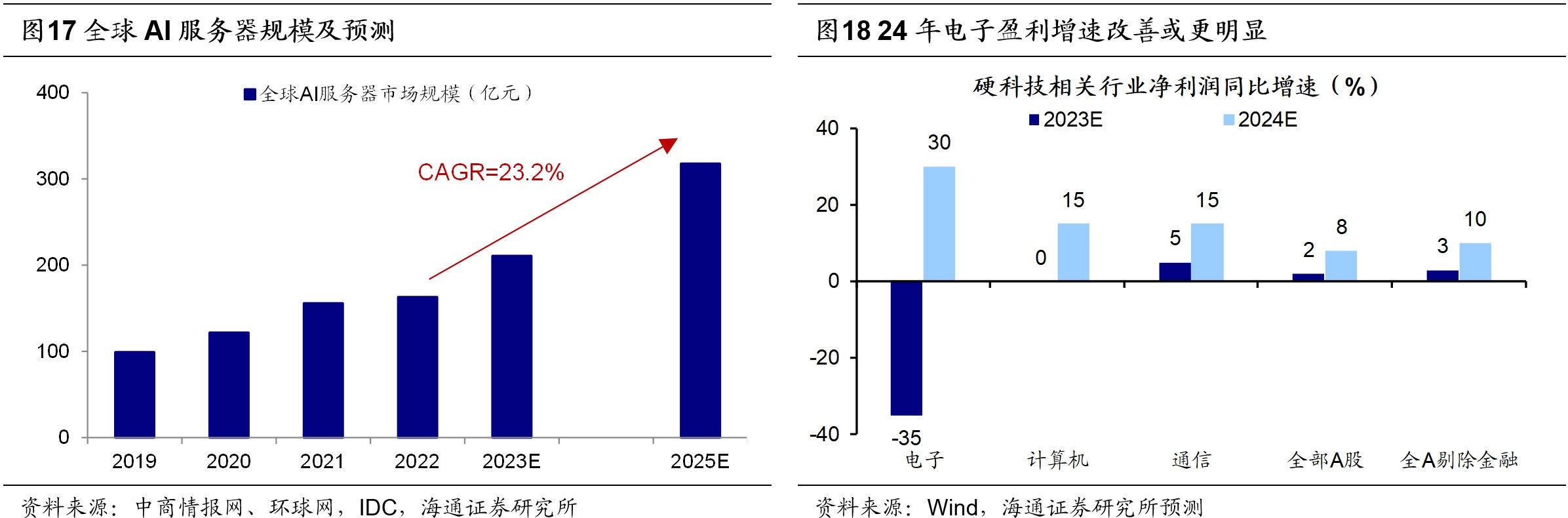 细分领域方面,白马成长中重视以电子为代表的硬科技制造。习总书记强调要积极培育战略性新兴产业与未来产业,加快形成新质生产力,我们认为,信息技术产业有望成为引领新质生产力发展的领域,重视以下三个领域:一是半导体周期回升背景下的电子,我们预计24年电子行业归母净利增速将达30%。二是或受益于财政发力的数字基建,根据中国通服基建产业研究院的《中国数据中心产业发展白皮书(2023年)》,预计“十四五”期间我国数据中心产业规模复合增速将达到25%左右。三是政策支持和技术突破下AI应用将提速,根据华经情报网的数据,预计22-25年间我国智能网联汽车市场CAGR为23.2%。白马成长中还应重视医药。目前医药生物板块的估值和基金配置仍处于较低水平。往后看,医疗反腐对行业的影响逐渐过去,并且中期来看我国人口老龄化正在加深,医疗需求将持续增加,未来一段时间医药的估值及公募基金等机构的持仓有望趋于均衡,结合行业分析师预测,24年医药归母净利增速有望达15%,细分子领域中可以关注创新药/血制品/高值耗材,24年归母净利有望分别达到30%/15%/15%。