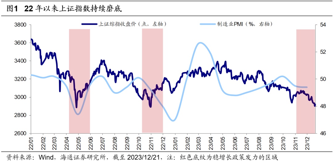 部分投资者认为24年市场或趋向弱震荡。回顾过去一年,市场在经历了2022年的偏弱行情后于23年再次走弱,与开年普遍的乐观预期形成了较明显的落差。事实上,本轮市场底部的形成过程确实较复杂。参考历史经验,A股市场在调整末期时一般政策底首先出现,此后随着积极政策推动经济和股市基本面企稳回升,标志着业绩底到来,在这个过程中有政策利好与基本面下行两股力量角力,因此政策底与业绩底之间存在市场底。对于本轮情况而言,我们认为22/04起A股已整体处在政策底的区间中,但一方面疫后国内经济曲折式前进,宏微观基本面的修复被显著拉长,23Q3全部A股归母净利润累计同比-2.9%,仍未恢复至正增长;另一方面海外美元指数及美债利率多次冲高、地缘政治冲突增多,内外部扰动因素交织导致本次A股底部形态较为复杂。