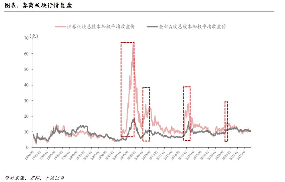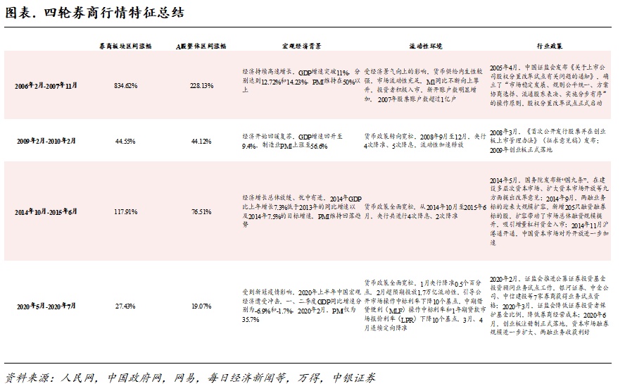 券商与A股行情高度相关,且往往受益于资本市场改革。券商板块行情与A股具有较高的相关性,二者在历史趋势走势上表现出了比较高的一致性,并且券商板块与资本市场密切相关,行情也往往受益于资本市场改革政策的推动。1994年以来券商板块主要有4次大涨行情,区间涨跌幅达20.0%或以上,分别是2006年2月-2007年11月、2009年2月-2010年2月、2014年10月-2015年6月、2020年5月-2020年7月。历次行情启动前,都伴随着国家对资本市场重视程度的提升,以及资本市场改革政策的推进。