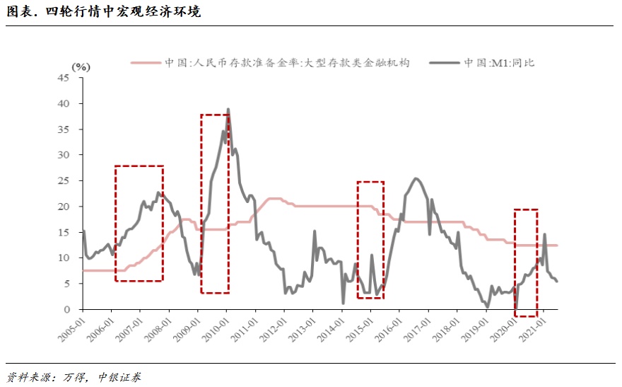 宽松的货币政策与积极的资本市场改革政策是券商行情的主要驱动力。综合四次行情特征来看,宽松的流动性环境和积极的行业政策是四次行情启动的共性条件。四次行情背景中三次有降息降准事件发生,2006.2-2007.11,虽然央行没有降准降息,但货币供给内生性较强,M1同比不断攀升。并且四次券商牛市背景中都有积极的行业政策出台,包括2006-2007年的股权分置改革、2009年-2010年的创业板开板、2014-2015年的新“国九条”、两融扩容、“沪港通”以及2020年的“注册制”等,相关政策增强券商业绩预期,对券商行情的启动具有重要催化作用。