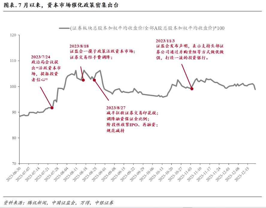 新一轮资本市场改革启动,券商行情可期。当前,券商行情启动的两个基本条件均已具备。流动性环境来看,从2023年3月以来,中期借贷便利利率MLF、贷款市场报价利率LPR和人民币存款准备金率均已实现三连降,流动性较为充裕,且2024年经济预期“弱复苏”下,货币环境有望继续维持宽松;行业政策方面,自7月以来,资本市场催化政策密集出台。7月24日,政治局会议提出“活跃资本市场,提振投资者信心”,随后减半征收证券交易印花税、调降融资保证金比例等一揽子具体资本市场催化政策出台,对投资者信心产生重要提振作用,11月3日,证监会发布声明支持头部证券公司通过并购重组等方式做优做强,打造一流的投资银行,市场对此预期强烈,其后浙商证券启动收购国都证券、国联证券成为民生证券主要股东,券商并购热潮的大幕已徐徐拉起,2024年资本市场改革的进程有望进一步延续和深化,催化新一轮券商行情。