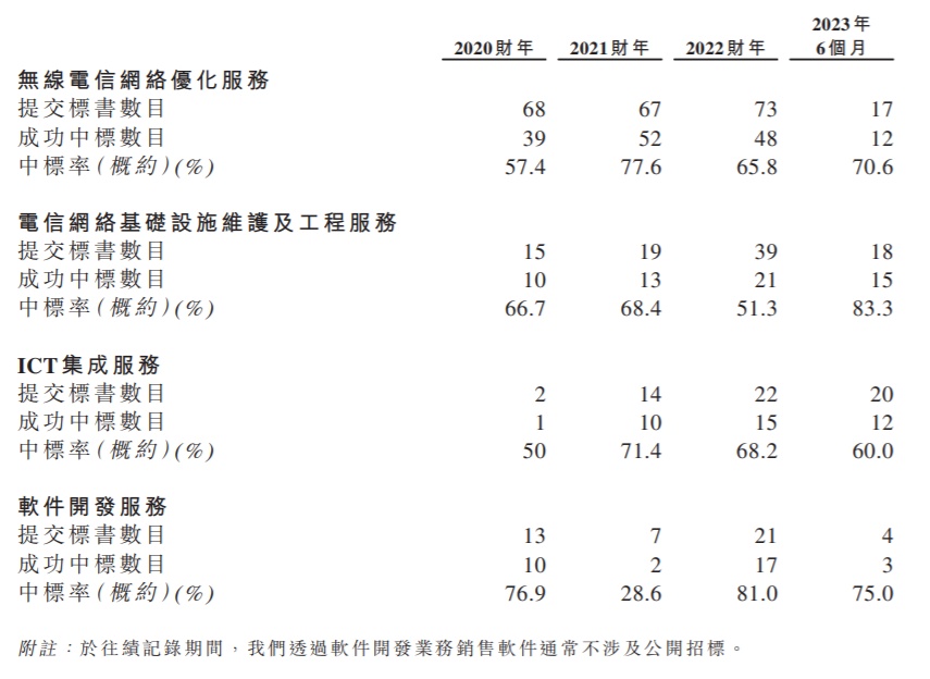 公司按业务线划分的提交标书数目及成功中标数目如下: