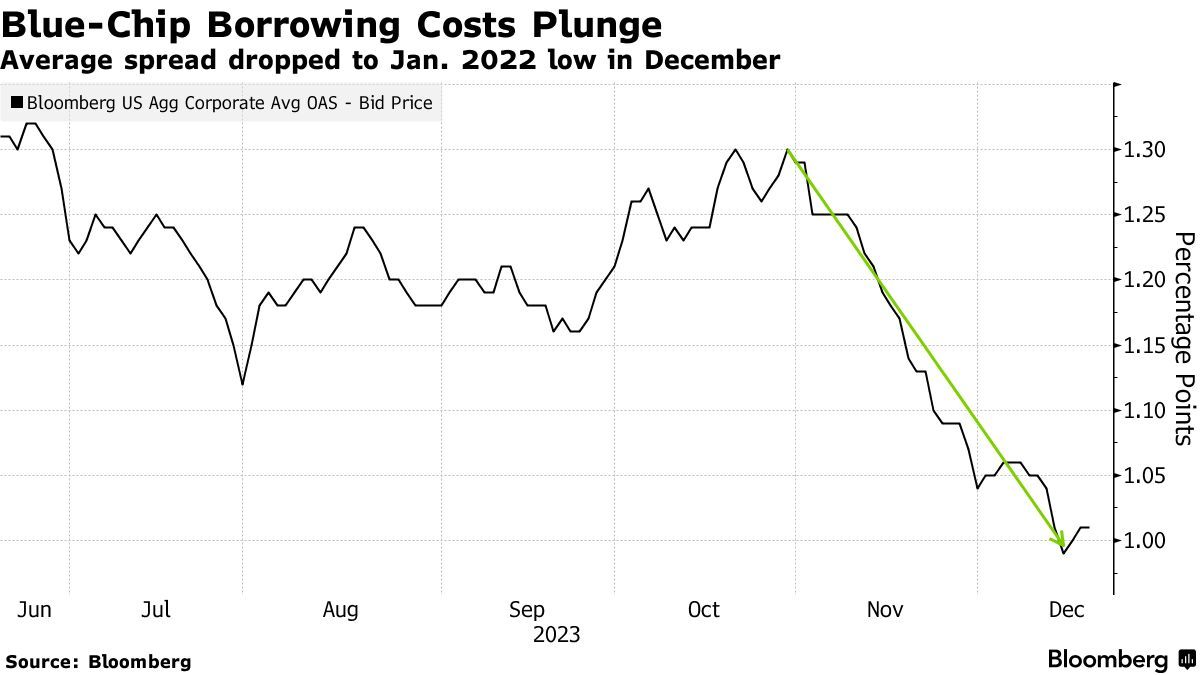 此外,过去六周,高评级债券发行人的借贷成本大幅下降。数据显示,投资级债券的平均利差已从10月30日的130个基点降至102个基点。与此同时,平均收益率从10月底的6.35%降至5.13%。
