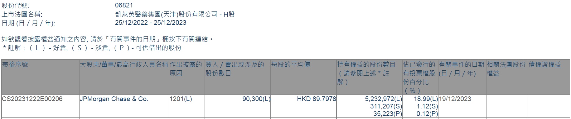 智通财经APP获悉,香港联交所最新资料显示,12月19日,小摩减持凯莱英(06821)9.03万股,每股作价89.7978港元,总金额约810.87万港元。减持后最新持股数目约为523.3万股,最新持股比例为18.99%。