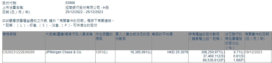 智通财经APP获悉,香港联交所最新资料显示,12月19日,小摩减持招商银行(03968)1638.5091万股,每股作价25.3076港元,总金额约为4.15亿港元。减持后最新持股数目约为3.08亿股,最新持股比例为6.71%。