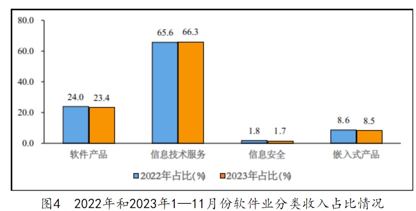 软件产品收入较快增长。1—11月份,软件产品收入25862亿元,同比增长11.3%,占全行业收入的比重为23.4%。其中,工业软件产品收入2509亿元,同比增长12.2%。