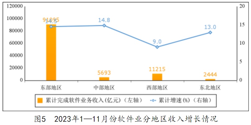 东部地区软件业收入加快增长,其他地区小幅回落。1—11月份,东部地区完成软件业务收入91095亿元,同比增长14.5%,增速较1—10月份提高0.6个百分点;中部地区完成软件业务收入5693亿元,同比增长14.8%,增速较1—10月份回落3个百分点;西部地区完成软件业务收入11215亿元,同比增长9%,增速较1—10月份回落1.2个百分点;东北地区完成软件业务收入2444亿元,同比增长13%,增速较1—10月份回落0.6个百分点。四个地区软件业务收入在全国总收入中的占比分别为82.5%、5.2%、10.2%和2.2%。