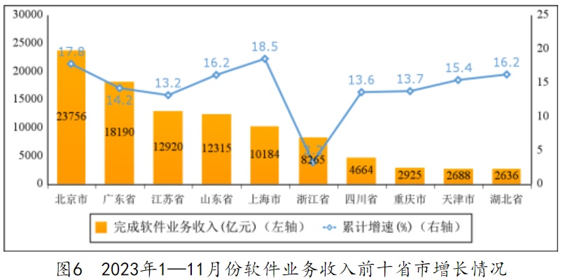 主要软件大省收入占比持续提升。1—11月份,软件业务收入居前5名的省份中,北京市,广东省,江苏省,山东省,上海市软件收入分别为23756亿元、18190亿元、12920亿元、12315亿元和10184亿元,分别增长17.8%、14.2%、13.2%、16.2%和18.5%,五省(市)合计软件业务收入77365亿元,占全国比重为70%,占比较去年同期提高1.2个百分点。