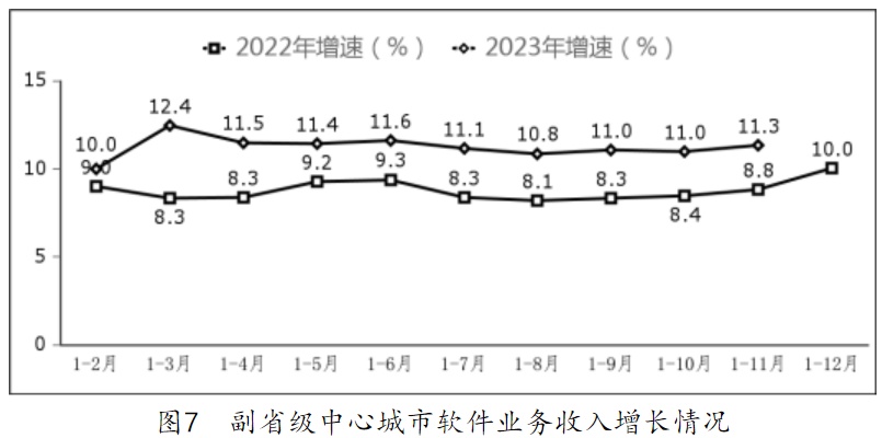 中心城市软件业务收入平稳增长。1—11月份,全国15个副省级中心城市实现软件业务收入53415亿元,同比增长11.3%,增速较1—10月份提高0.3个百分点,占全国软件业务收入比重为48.4%,占比较去年同期回落1.1个百分点。其中,武汉、大连、深圳和济南软件业务收入增速超过全行业整体增速。