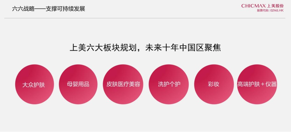 基于六大竞争面的综合实力提升,上美未来十年将重点布局大众护肤、母婴用品、皮肤医疗美容、洗护个护、彩妆、高端护肤+仪器六大板块,以多品牌、多赛道的矩阵模式,提升企业抵御风险,长期发展的可持续能力。