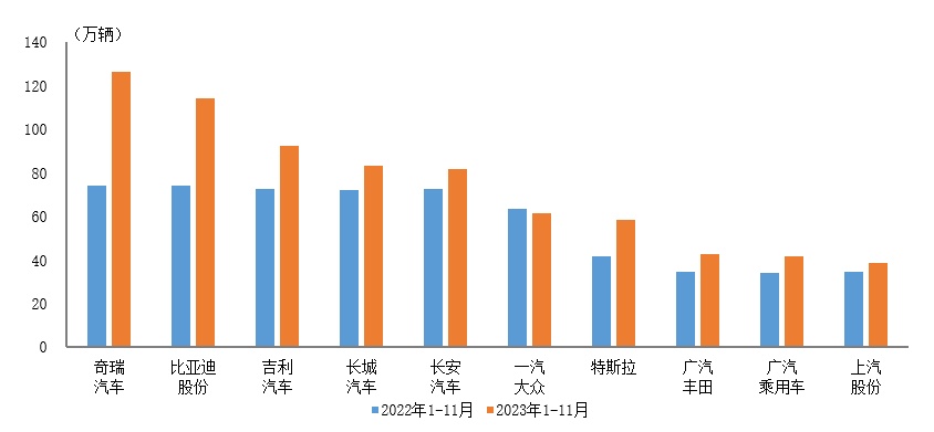 智通财经APP获悉,据中国汽车工业协会统计分析,2023年1-11月,销量排名前十位的SUV生产企业共销售742.6万辆,占SUV销售总量的62.9%。在上述十家企业中,与上年同期相比,除一汽大众小幅下降外,其他企业均呈两位数增长,其中奇瑞汽车增速最为显著。