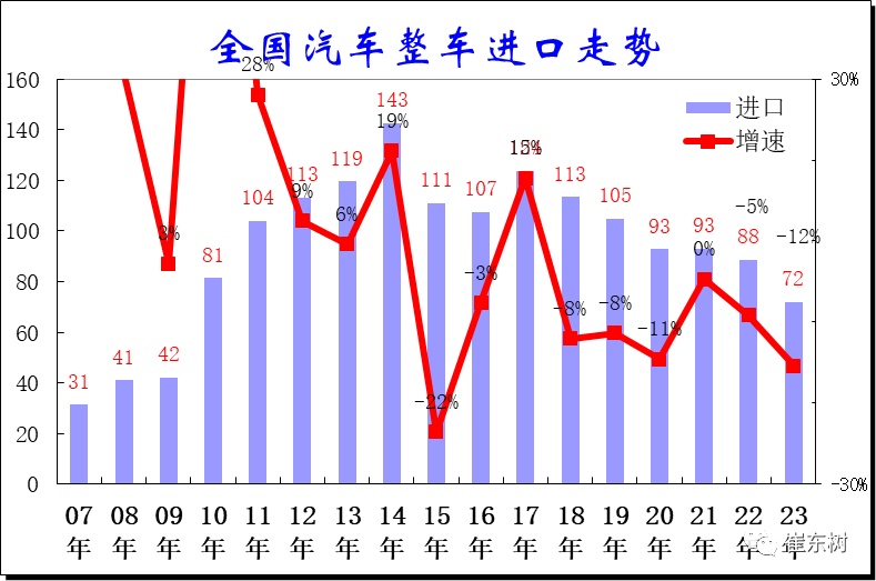 在2013-2015年世界经济低迷情况下的剧烈下滑后,2016-2017年进口增速稍有企稳改善,2018-2020年以来持续下滑,2021年稍有企稳,2022年的进口车回升态势被疫情影响。