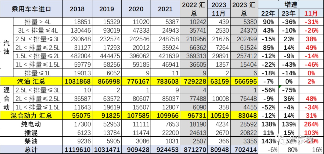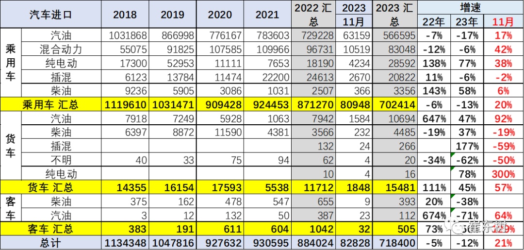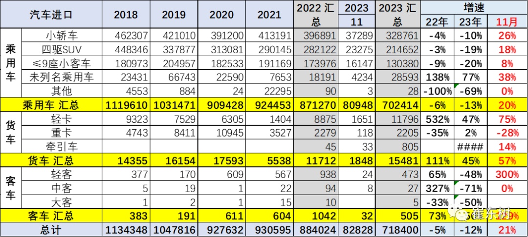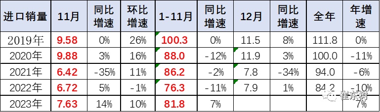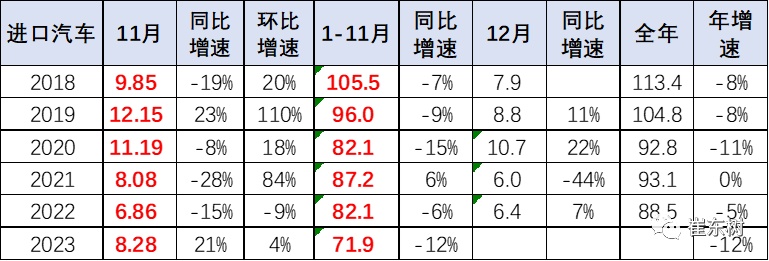 智通财经APP获悉,12月26日,乘联会秘书长崔东树发文称,2023年1-11月进口车进口71.9万台,同比降12%,11月汽车进口8.28万台,同比增长21%。近期汽车进口逐步回暖,11月创出今年进口新高。进口市场增长的核心动力仍然是乘用车的消费升级,因此相对于普通燃油车,豪华车与进口车的走势总体是很好的,但电动化转型改变了燃油车需求,进口燃油车需求也出现明显下降。随着国际关系的不断复杂,还是要未雨绸缪建立更多的进口模式,维持进口车合理规模。