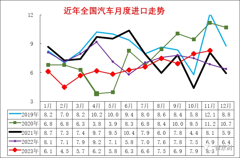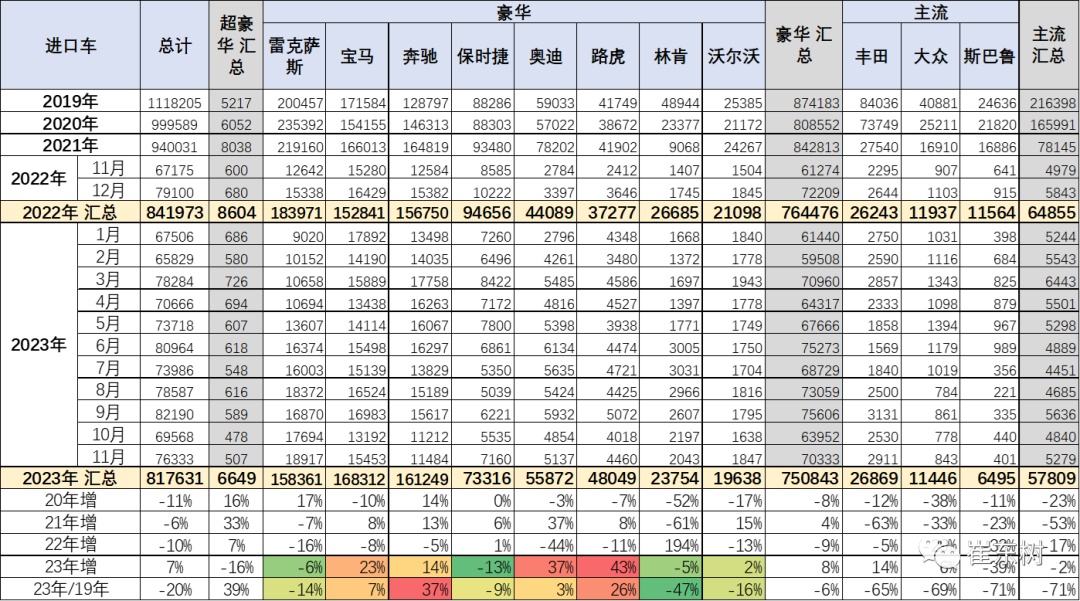 2023年呈现低开高走的态势,1-5月进口较2022年大幅走低,6-8月进口走势回暖,9月走势稍弱,11月进口车表现很强。