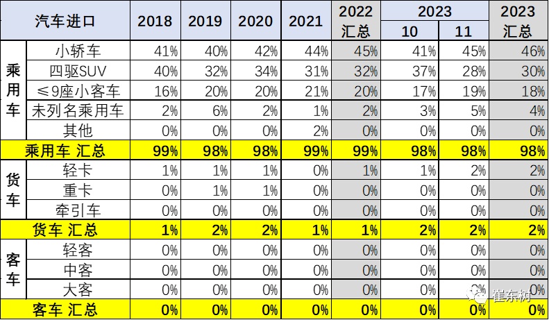 今年汽车进口结构中的乘用车占到98%的绝对主力地位,其中近两年四驱SUV进口偏弱。