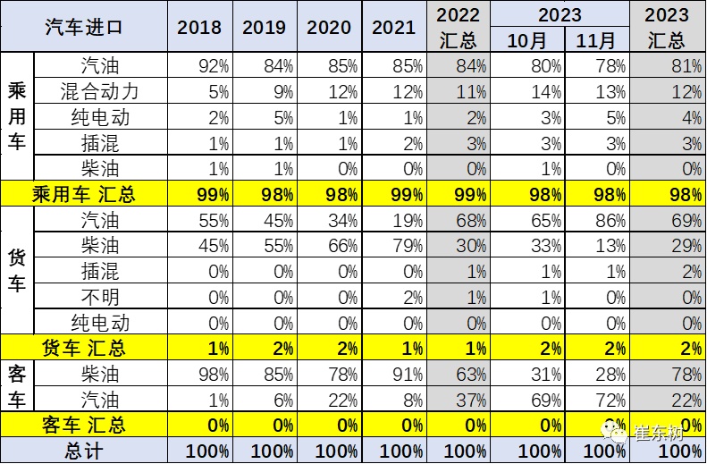 卡车中柴油车占比下降,而汽油货车的占比大幅提升。2023年1-11月的高端汽油皮卡进口表现改善。