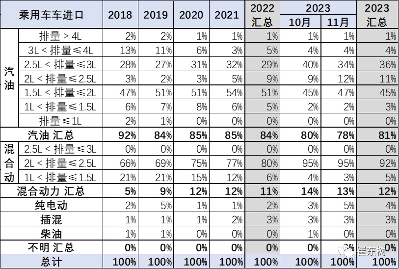 2023年1-11月的2-3升的汽油车型表现稍有改善,大排量表现一般,中低端萎缩,高端化特征仍明显。