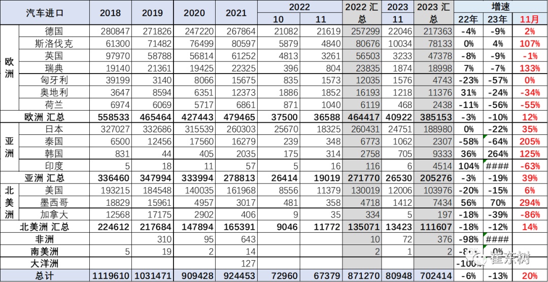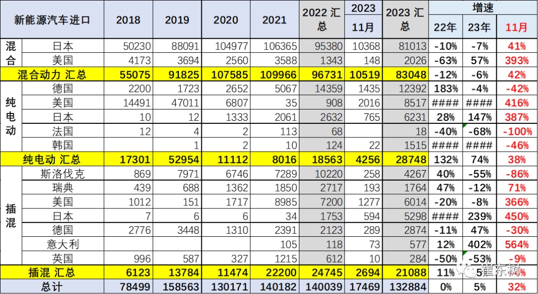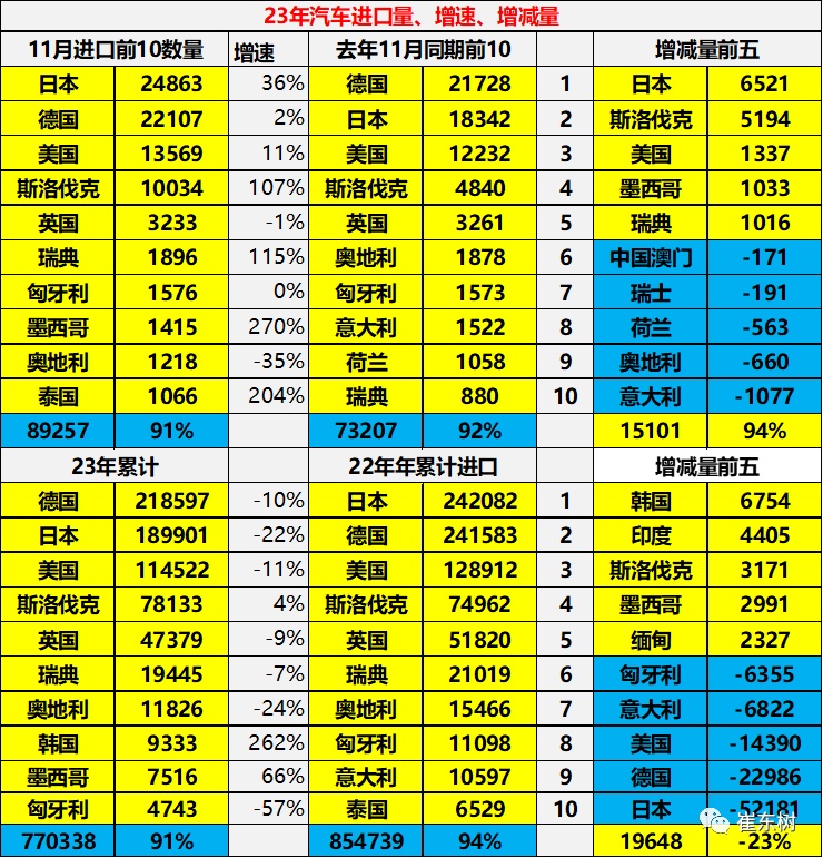 2023年进口车表现相对优秀的是韩国、印度、墨西哥等前期非主力国家,而11月日本和斯洛伐克等进口车增量很好。