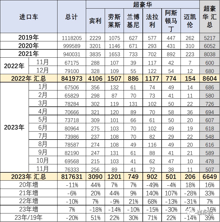 超豪华车的进口总体强势,过去几年持续增长,2023年出现下滑。超豪华总体走强体现超高端消费群体的购买力实际上是上升的。