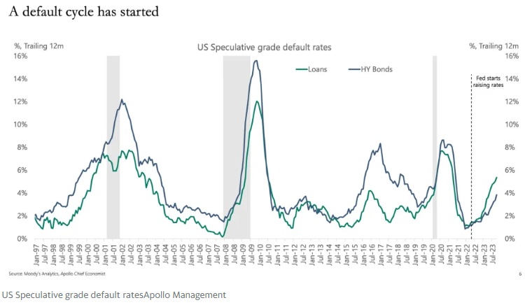 智通财经APP注意到,随着高债务成本开始影响美国企业,信贷市场正在看到地平线上的一些乌云。阿波罗管理公司的经济学家认为,这些乌云是由美联储挂钩利率引发的违约周期的开始。