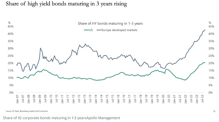 尽管如此,根据Apollo的数据,仍有相当数量的高风险债务将在近期到期,其中美国约为20%,欧洲近45%。