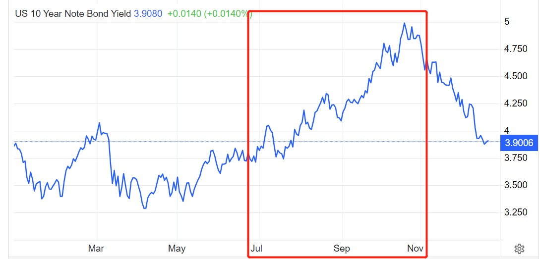 在11月长期限美债拍卖期间,整体标售收益率符合市场预期,且基本上未出现供过于求局面,叠加财政部放慢发债节奏,市场对债息成本和供应过剩的担忧降温,加之投资者试图在美联储最终启动宽松周期前以及面临不确定的宏观环境时锁定收益率,纷纷拥抱高达5%的无风险收益率,刺激美债收益率下行。