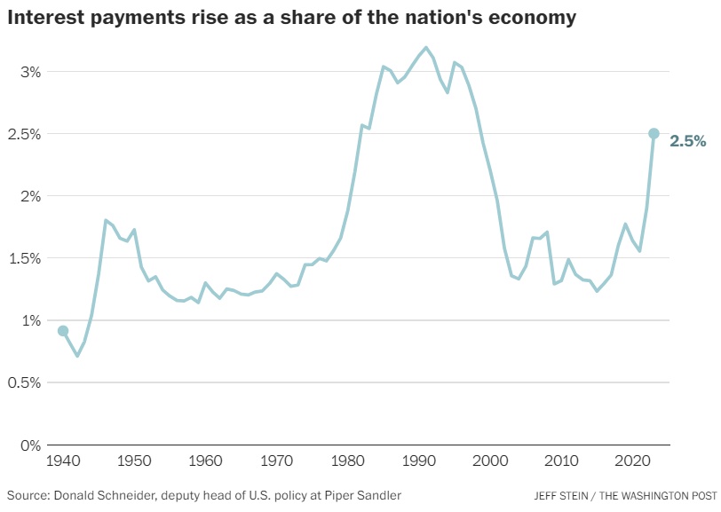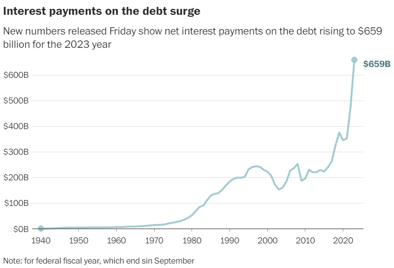 细分数据显示,在上一财年的政府支出中,大约有6590亿美元用于累计债务的净利息,高于2022财年的4750亿美元,创下历史之最。