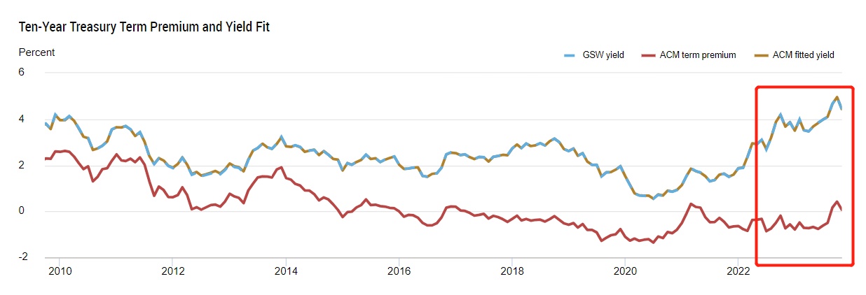 赤字水平如此之高,尤其是未偿还债息或将不断攀升,自然引起市场警觉,进而不断提高收益率来对冲“美国政府未来可能违约支付债息”的这一担忧情绪,最直接的体现就是“期限溢价”在10月份令人印象深刻——自2021年6月以来首次回到正值区间。所谓期限溢价,指的投资者持有长期债券风险所要求的额外补偿。