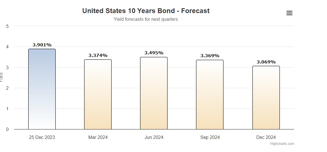 此外,国债统计平台World Government Bonds公布的预测数据则更低,通过计量经济学模型和趋势跟踪算法,该平台预计到2024年3月底,10年期美债收益率预计为3.374%,预计截至2024 年 12 月的收益率则约为 3.069%。