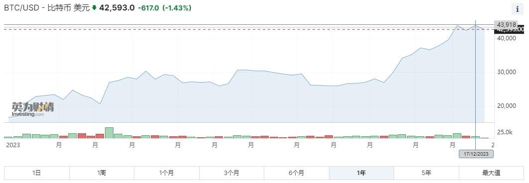 如果要谈到今年最值得关注的资产,那毫无疑问是比特币。在2022年暴跌65%之后,比特币今年的涨幅领跑市场。其价格从年初的约1.9万美元一路飙升到年底的4.4万美元,涨幅超过了136%。