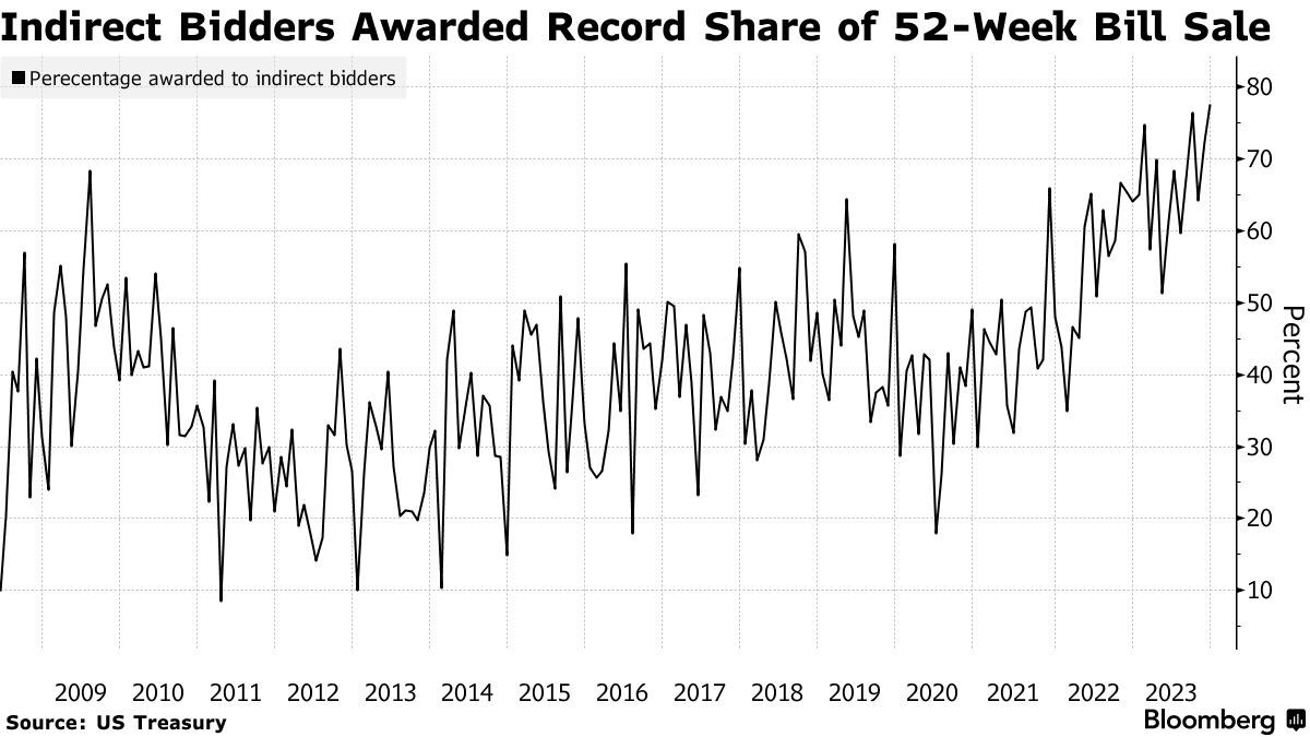 数据显示,包括外国央行在内的间接竞标者在美国财政部的52周国库券的拍卖中获得了创纪录的77.6%的份额;在美国财政部的6个月国债的拍卖中获得的份额为71.6%,创有史以来第三高水平。与此同时,两年期美债拍卖的得标利率为4.314%(前次为4.887%)——低于拍卖时的收益率,投标倍数2.68(前次为2.54),表明需求高于预期。