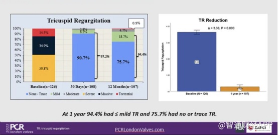 本次LuX-Valve确证性临床研究共纳入126例重度三尖瓣返流患者,旨在评估LuX-Valve经导管三尖瓣置换系统在重度三尖瓣反流患者中的安全性和有效性,临床试验主要终点为术后一年累积全因死亡率。临床试验一年访问数据显示,根据超声数据,99.1%的患者三尖瓣反流等级得到改善,94.4%的患者三尖瓣反流分级降低至轻度及以下,75.7%的患者恢复至无/微量三尖瓣反流。