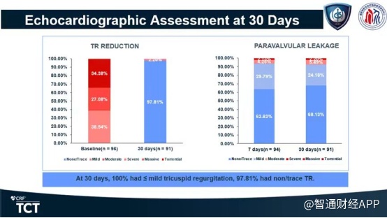与此同时,二代产品LuX-Valve Plus经血管三尖瓣置换系统的多中心临床试验结果也于近期在2023年美国经导管心血管治疗大会(TCT)正式发布。本次临床试验共纳入96例患者,所发布的一个月临床数据终点为手术后30天复合事件发生率。随访30天数据显示,根据超声数据,100%患者三尖瓣反流等级得到改善,97.81%的患者三尖瓣反流分级降低至无或者微量。