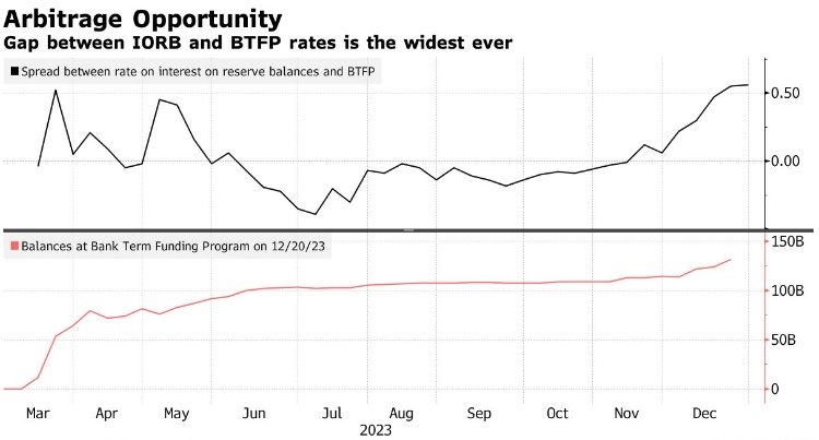 自从美联储本月早些时候转向预测明年会有更多的降息以来,隔夜指数掉期(OIS)利率跟随他们一路下跌,BTFP也随之下跌,从而提高了套利交易的吸引力。根据美联储的最新数据,在截至12月20日的一周内,较低的成本推动借款达到创纪录的1310亿美元。随着银行融资条件从极端水平放松,央行作为紧急流动性后盾的作用减弱,越来越多的融资使用,加上套利机会,导致市场参与者质疑美联储是否会关闭这一将于2024年3月11日到期的新贷款窗口。美联储官员尚未就BTFP是否会延长发表评论。