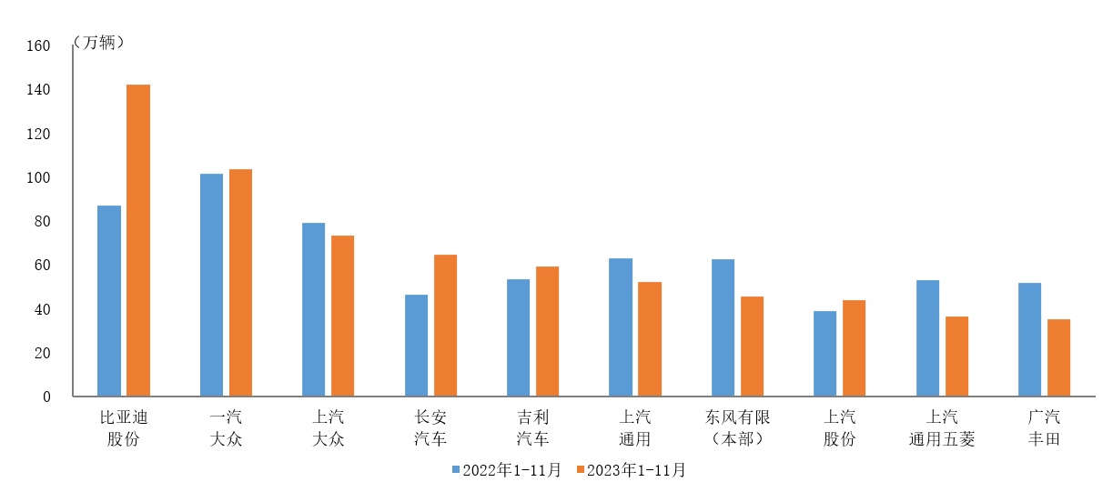 智通财经APP获悉,据中国汽车工业协会统计,2023年1-11月,销量排名前十位的轿车生产企业共销售654.3万辆,占轿车销售总量的63.8%。在上述十家企业中,与上年同期相比,比亚迪股份(01211)、长安汽车(000625.SZ)、上汽股份和吉利汽车(00175)呈两位数增长,一汽大众小幅增长,其他企业呈不同程度下降。