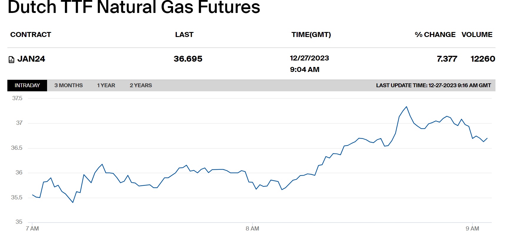 智通财经APP获悉,在以色列和哈马斯冲突升级的背景下,欧洲天然气期货价格继续上行,市场担忧中东地区这场冲突有可能扩大为一场更广泛的地缘政治冲突,欧洲天然气价格基准——TTF天然气期货价格周三开始交易后直线上涨超7%。此前美国对伊拉克某一目标发动袭击,胡塞武装分子又对红海地区的“以色列相关商船”只发动袭击,加剧了人们对中东局势越来越不稳定的担忧,国际原油价格也因红海航运危机发酵而持续上涨至12月最高点。截至发稿,荷兰TTF近月天然气期货价格涨幅达到7.377%,至每兆瓦时36.695欧元。