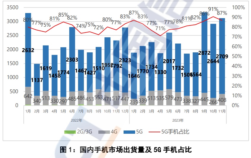智通财经APP获悉,12月27日,中国信通院数据显示,2023年11月,国内市场手机出货量3121.1万部,同比增长34.3%,其中,5G手机2709.2万部,同比增长51.2%,占同期手机出货量的86.8%。2023年1-11月,国内市场手机总体出货量累计2.61亿部,同比增长7.1%。其中,5G手机出货量2.15亿部,同比增长12.9%,占同期手机出货量的82.5%。