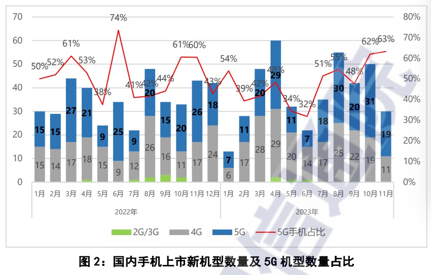2023年11月,国内手机上市新机型30款,同比下降30.2%,其中5G手机19款,同比下降26.9%,占同期手机上市新机型数量的63.3%。