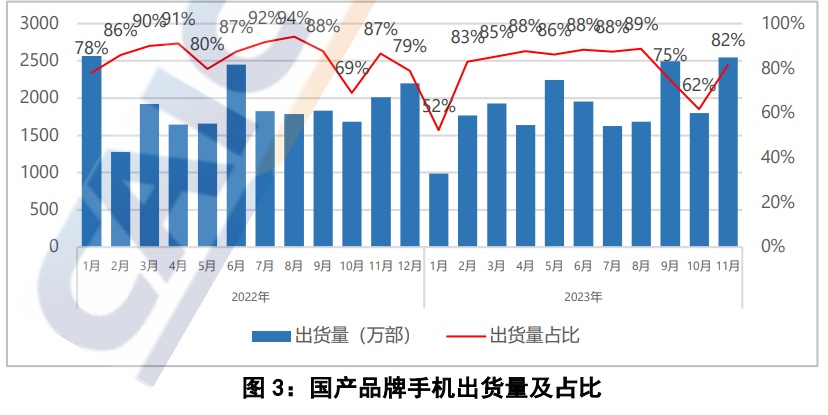 2023年1-11月,国产品牌手机出货量累计2.07亿部,与上年同期基本持平,占同期手机出货量的79.2%;上市新机型累计380款,同比增长10.1%占同期手机上市新机型数量的91.6%。