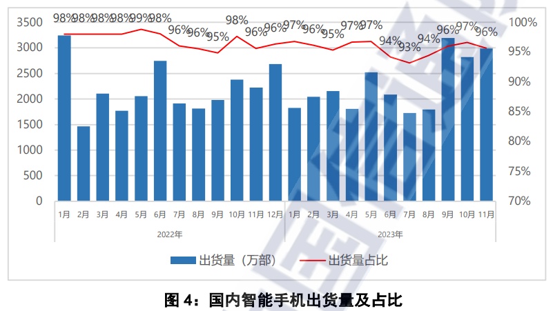 2023年11月,智能手机出货量2985.6万部,同比增长34.4%,占同期手机出货量的95.7%。2023年1-11月,智能手机出货量2.50亿部,同比增长5.4%,占同期手机出货量的95.7%。