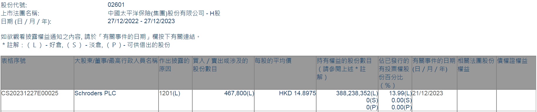 智通财经APP获悉,香港联交所最新资料显示,12月21日,Schroders PLC减持中国太保(02601)46.78万股,每股作价14.8975港元,总金额约为696.91万港元。减持后最新持股数目约为3.88亿股,最新持股比例为13.99%。