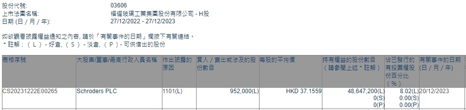 PLC增持福耀玻璃(03606)95.2万股,每股作价37.1559港元,总金额约为3537.24万港元。增持后最新持股数目为4864.72万股,最新持股比例为8.02%。
