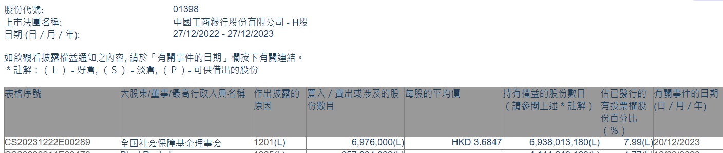智通财经APP获悉,香港联交所最新资料显示,12月20日,全国社会保障基金理事会减持工商银行(01398)697.6万股,每股作价3.6847港元,总金额约为2570.45万港元。减持后最新持股数目约为69.38亿股,最新持股比例为7.99%。