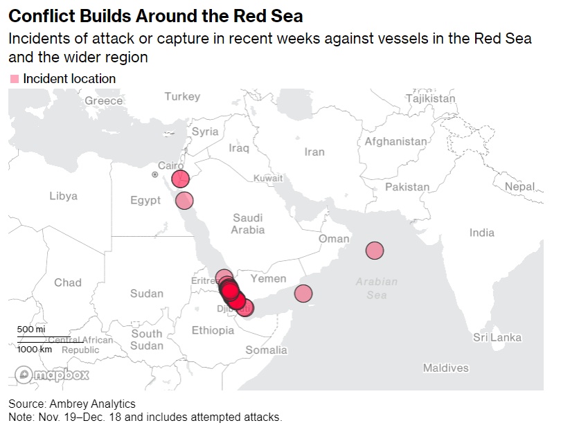 红海周边冲突不断出现——最近几周,在红海和更广泛的地区发生了针对商业船舶的袭击或劫持事件