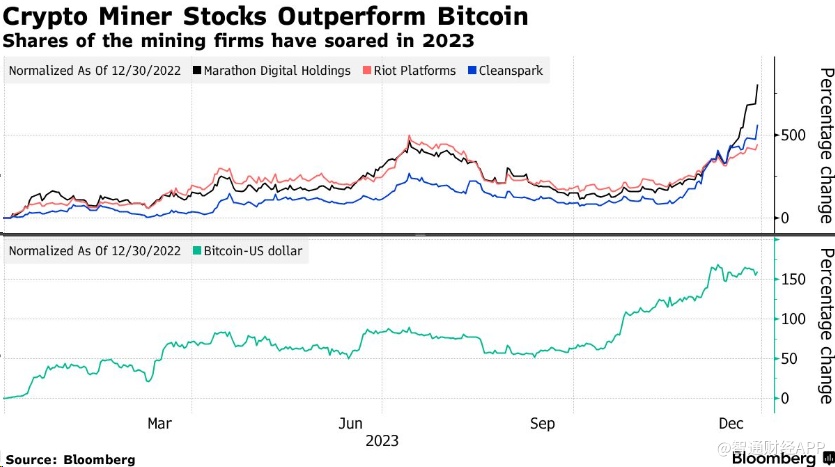 Platforms(RIOT.US)等比特币矿商的股票表现明显优于比特币,这两只个股今年涨幅分别超过800%和400%。与此同时,美国加密货币交易所Coinbase(COIN.US)和押注比特币的企业软件公司MicroStrategy(MSTR.US)同期涨幅均超过350%。比特币在2023年上涨了160%左右。