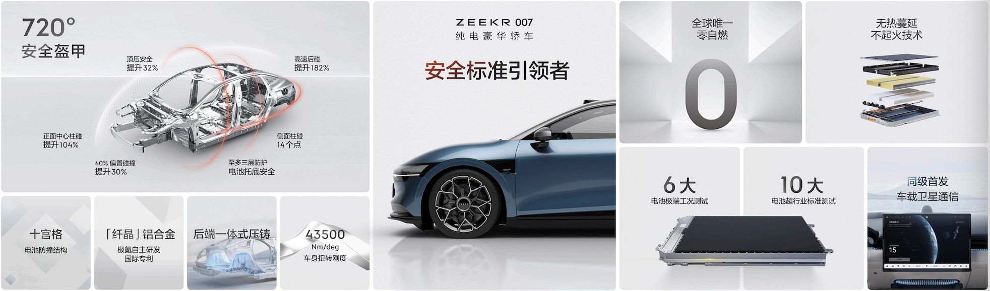 从品牌创立开始,极氪就将深厚的安全底蕴写进品牌基因。交付超19万,全球唯一零自燃,极氪式安全经历过无数真实案例验证。得益于近30年造车底蕴和集团资源全面赋能,来自浩瀚原生纯电架构的安全天赋,极氪式安全在极氪007身上,既有传承,又有进阶。在车身工艺方面,极氪007采用一体式压铸后端铝车身,它的扭转刚度达到43500 N·m/deg,不仅领先同级,更超越百万级豪华轿车;在材料创新上,极氪007应用全新的「纤晶」铝合金材料,流动性更高,成型后的压铸件一致性更好,韧性更强,屈服强度提升10%以上。同时,极氪007的后碰变形量也减少了16%。