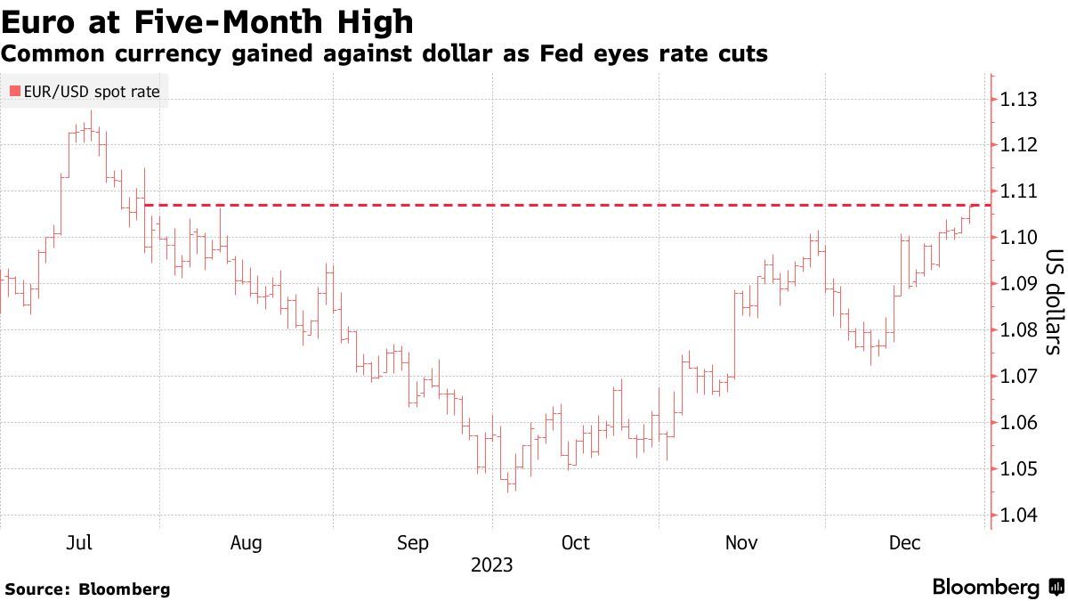 智通财经APP获悉,周三,欧元兑美元汇率升至7月底以来的最高水平,美联储发出的即将转向降息的信号继续支撑风险偏好上涨。欧元兑美元汇率一度攀升0.3%,至1.1070。欧元是十国集团(G10)中涨幅最大的货币之一,今年以来已上涨3.4%,其中大部分涨幅发生在美联储公布12月利率决议之后的几周。