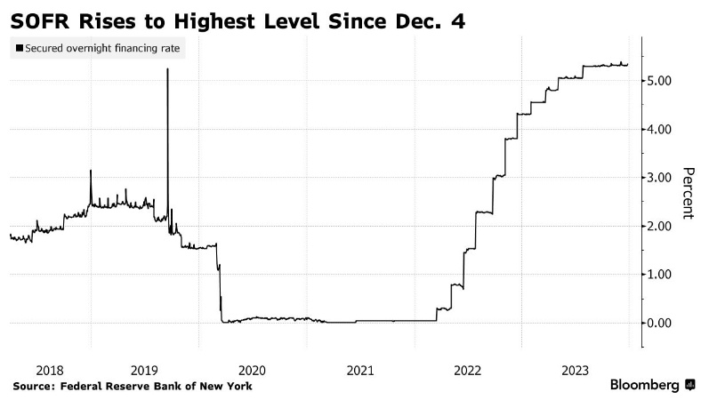 担保隔夜融资利率(SOFR)是与隔夜回购协议交易相关的参考利率。当融资成本上升时,SOFR往往也随之上升。根据纽约联储周三公布的数据,截至12月26日,SOFR从上一交易日的5.32%固定在5.35%,略低于12月1日达到的历史最高点5.39%。