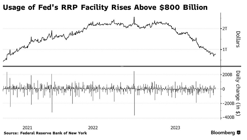 美联储的反向回购机制(RRP)一直是交易对手(主要是货币市场共同基金)存放多余现金以赚取市场利率(目前为5.3%)的地方。随着银行减少回购市场活动以整理资产负债表,这一举动刺激了货币基金将更多现金转移到RRP。本周三,90个交易对手在该机制中存放了8,190亿美元,为12月13日以来最高值。