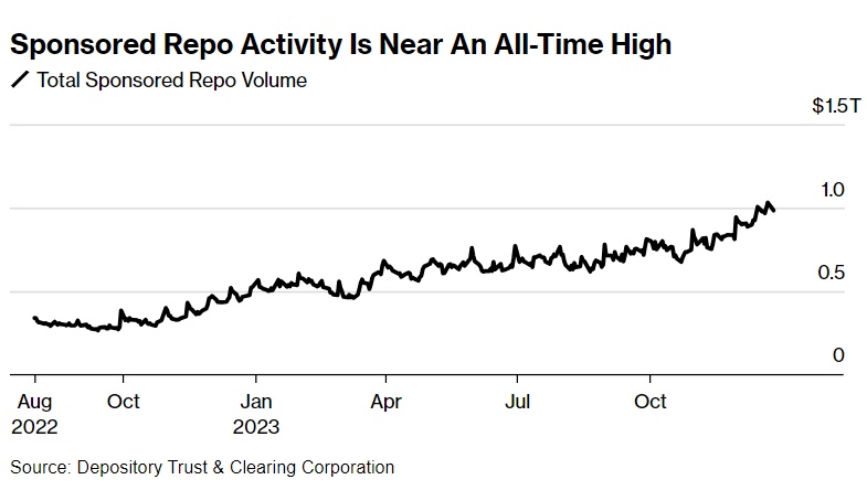 美国证券存托清算公司(DepositoryTrust&ClearingCorp.)的数据显示,截至12月22日,赞助回购活动总额已上升,甚至已达1.031万亿美元的历史新高,主要因为赞助回购交易允许贷款人与货币市场基金和对冲基金等交易对手进行交易,而不必受限于自身资产负债表的监管。这些协议实际上通过固定收益清算公司的回购平台进行“赞助”或清算,从而允许交易商银行对交易双方进行净额结算,并减少所持有资本金。